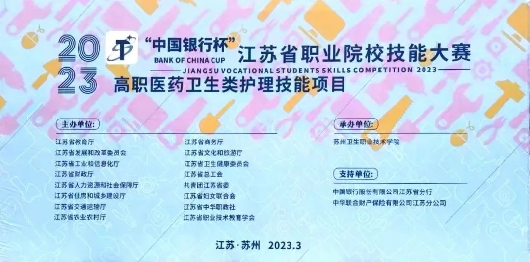 由江苏省教育厅、江苏省发改委等16个部门共同主办,苏州卫生职业技术学院承办,2023年“中国银行杯”江苏省职业院校技能大赛高职医药卫生类护理技能项目于35日顺利闭幕!技能大赛的成功举办对于推进新时代职业教育服务技能型社会发挥了积极作用。